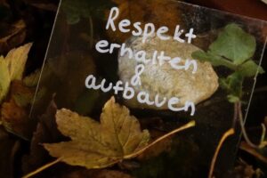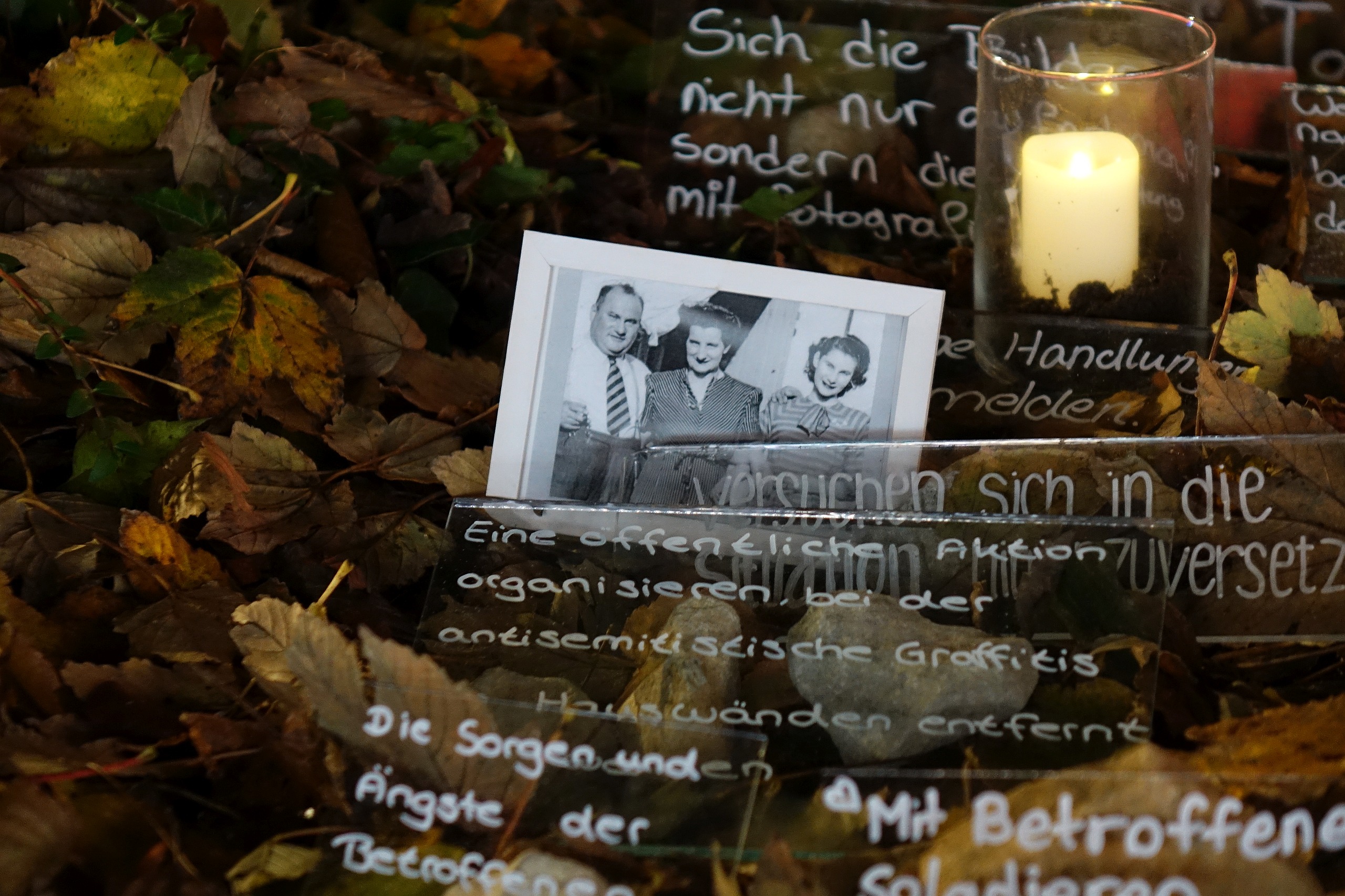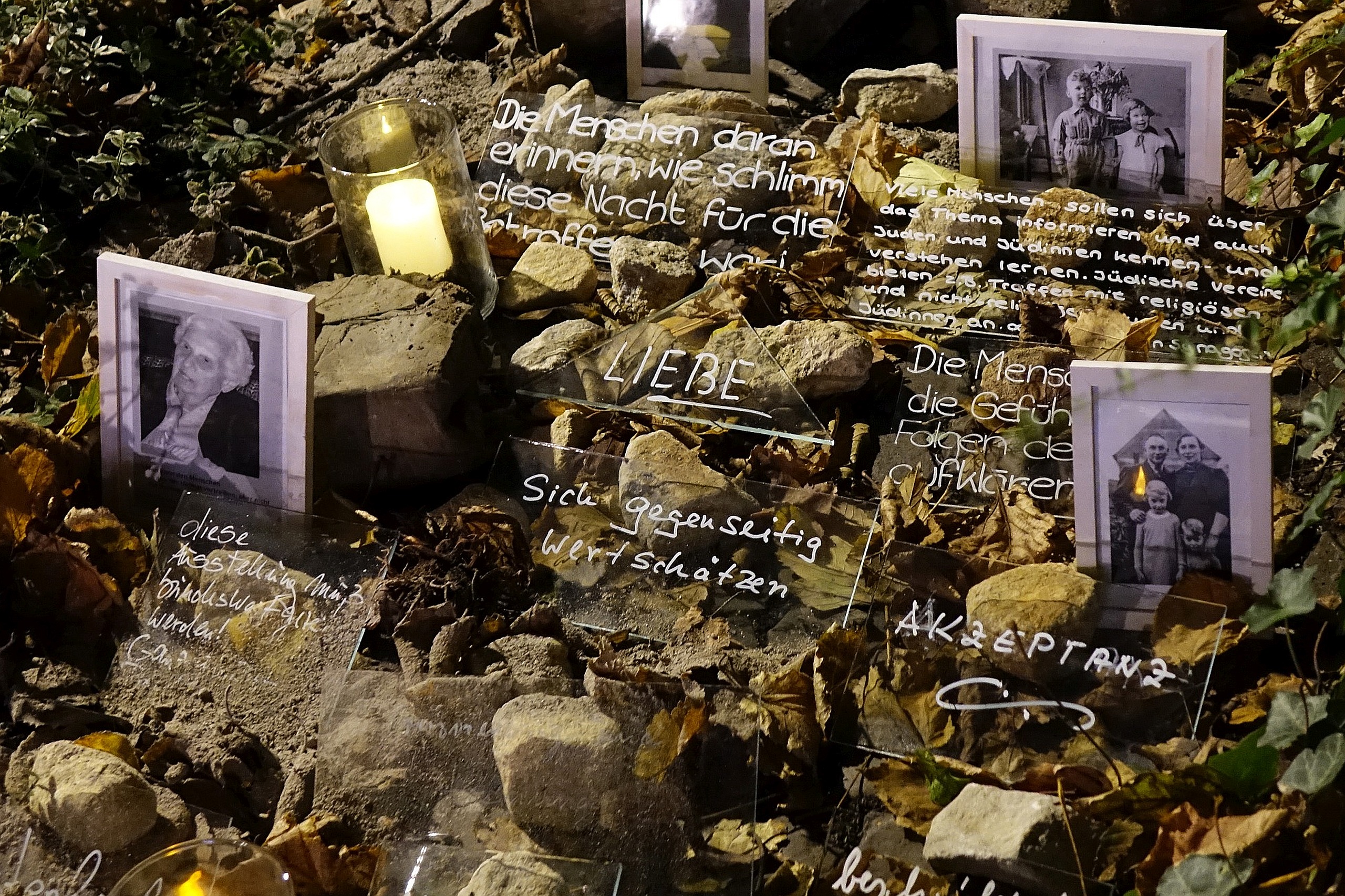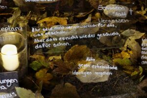 Eine Installation an dem Gedenkstein in 2023 brachte Gedanken der Gegenwart und Bilder der Vergangenheit zusammen.