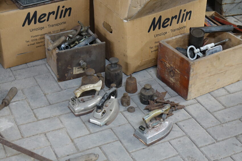 Hier warten „Schätze“ auf Sie, die wir versuchen werden wie „warme Semmeln“ an Mann, Frau und alle anderen Interessierten zu bringen. Echte Fundstücke aus der Alten Schmiede in der Münsterstraße 22 – von alten Holzwaschmaschinen, einem Badeofen der noch mit Feuer betrieben wurde, bis hin zu Hufeisen und allerlei Schrott, der voller Geschichte steckt. Falls noch jemand Fahrradspeichen benötigt, gibt es diese ebenfalls, denn Fahrräder wurden in der Alten Schmiede auch schon repariert.