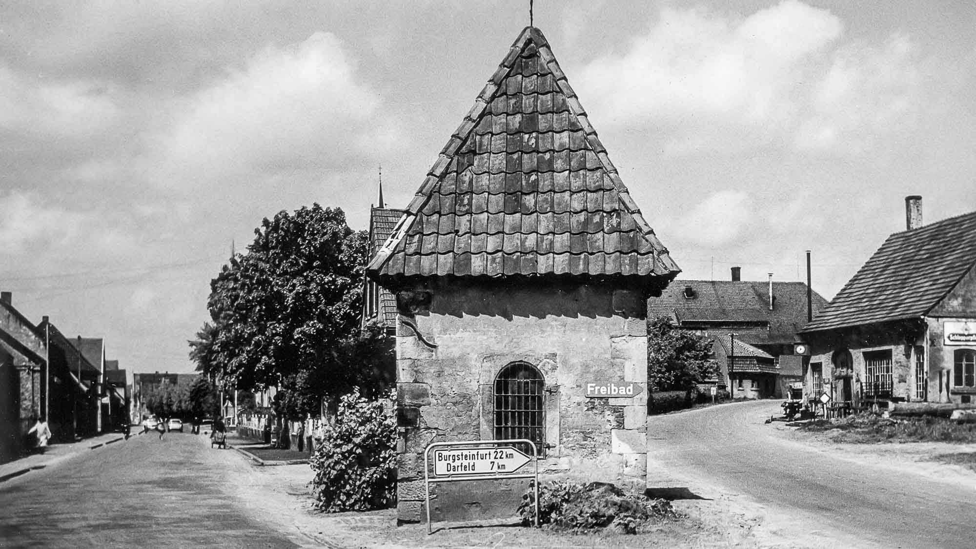 Dies Baudenkmal auf quadratischem Grundriss mit verputzen Fassaden und einer Eckverzahnung aus Baumberger Kalksandstein wurde 1687 von dem Coesfelder Kaufhändler Otto Duesburg errichtet.
