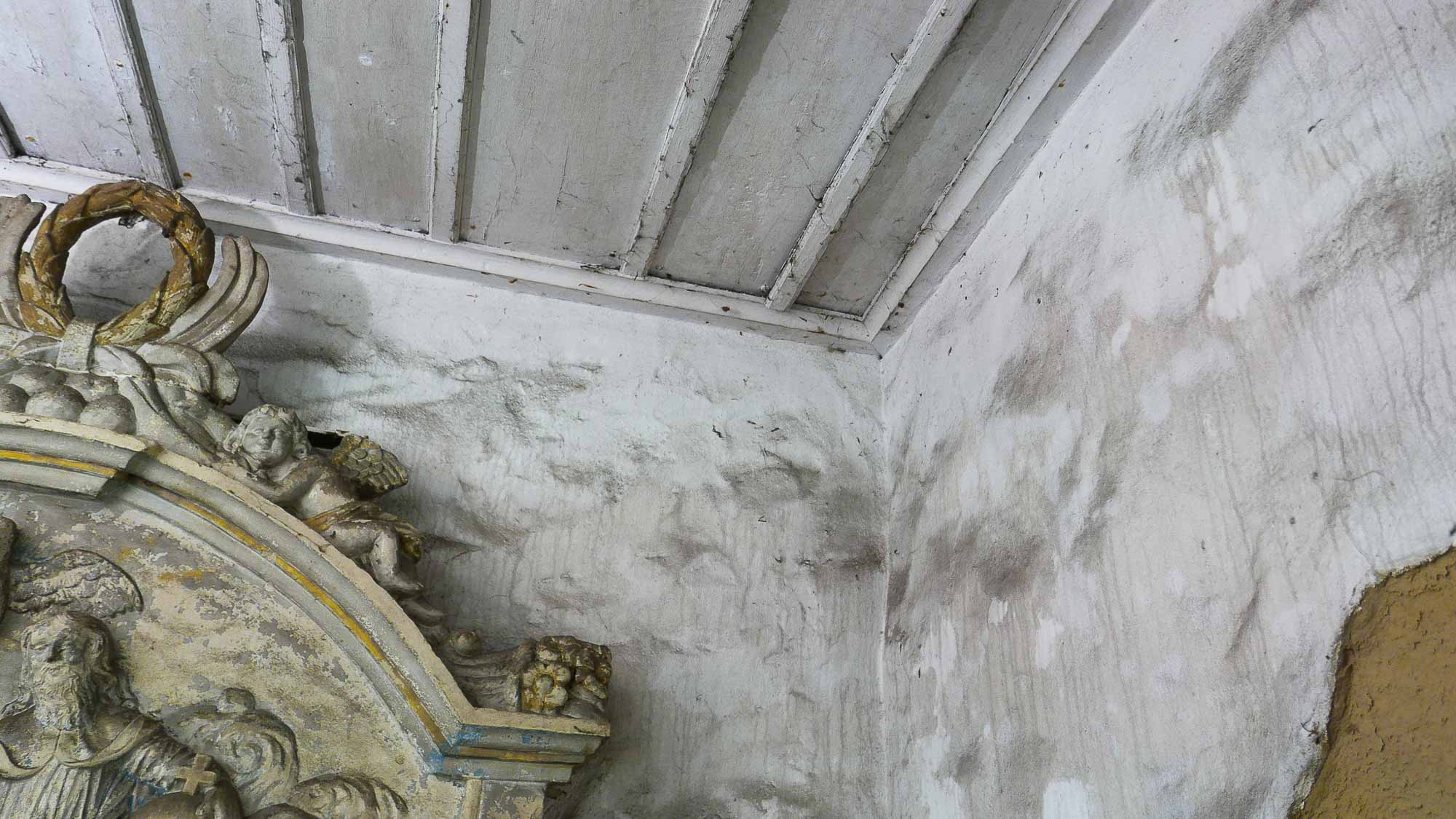 Zwei lose Latten der Holzdecke wurden wieder befestigt sowie Löcher und Spalten mit Acrylkittmasse gefüllt. Vor dem Auftrag von zwei Schichten PU-Lack stand zuvor noch das mechanische Entfernen loser Farbschollen an. Ein blau-farbiger Fassungsrest zeigte sich dabei am äußeren Profil der Holzdecke. Dies lässt die Annahme zu, dass zumindest dieses Profil einmal eine blaue Farbgebung hatte.