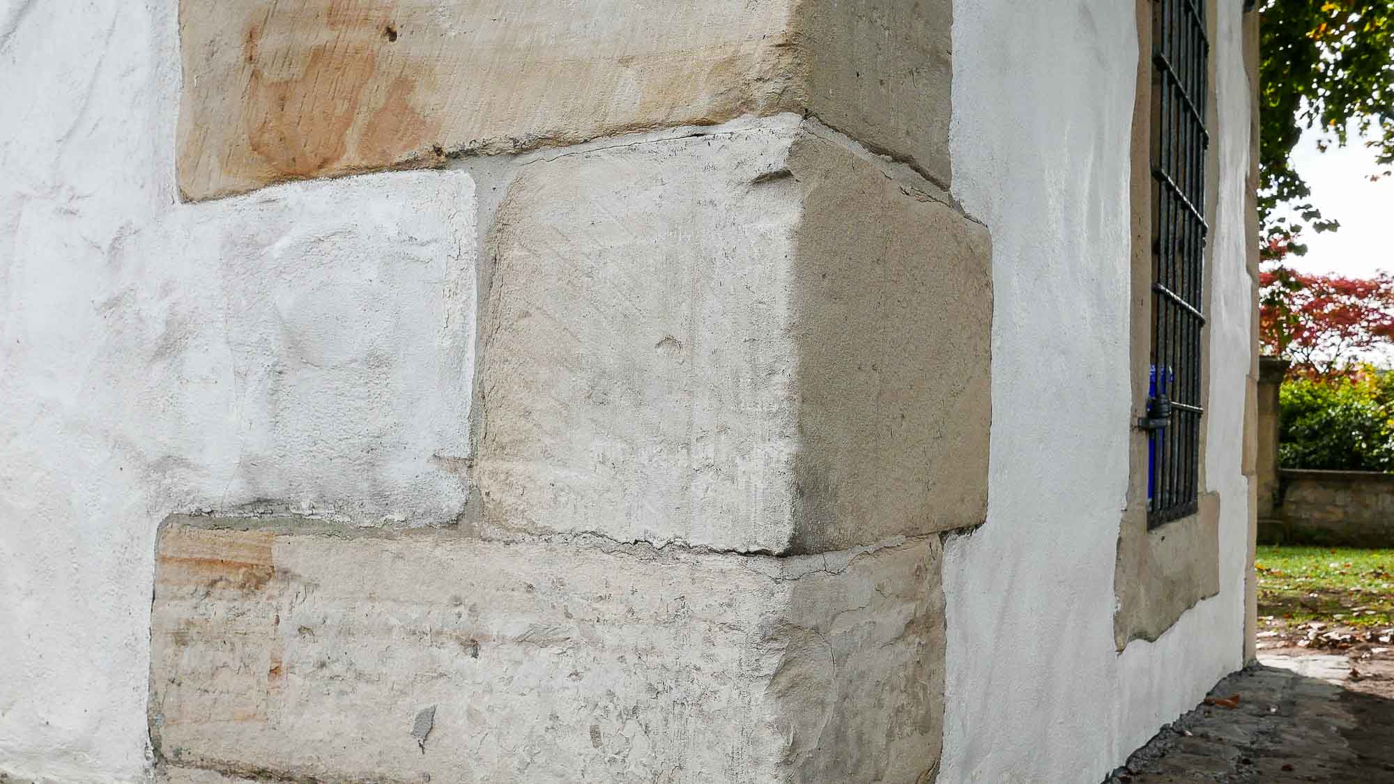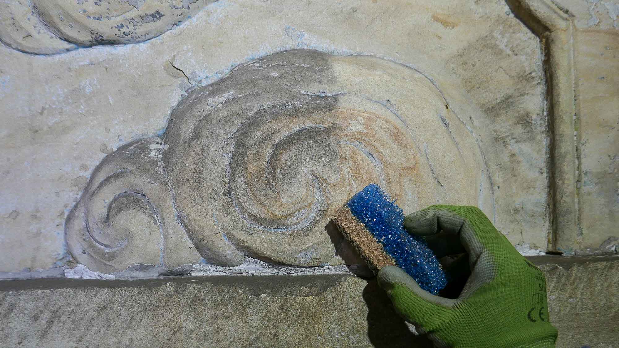 Anschließend sind die Natursteinbereiche durch Kittungen und Schlämmen im Bereich vorhandener Schalenränder und Risse versorgt worden.