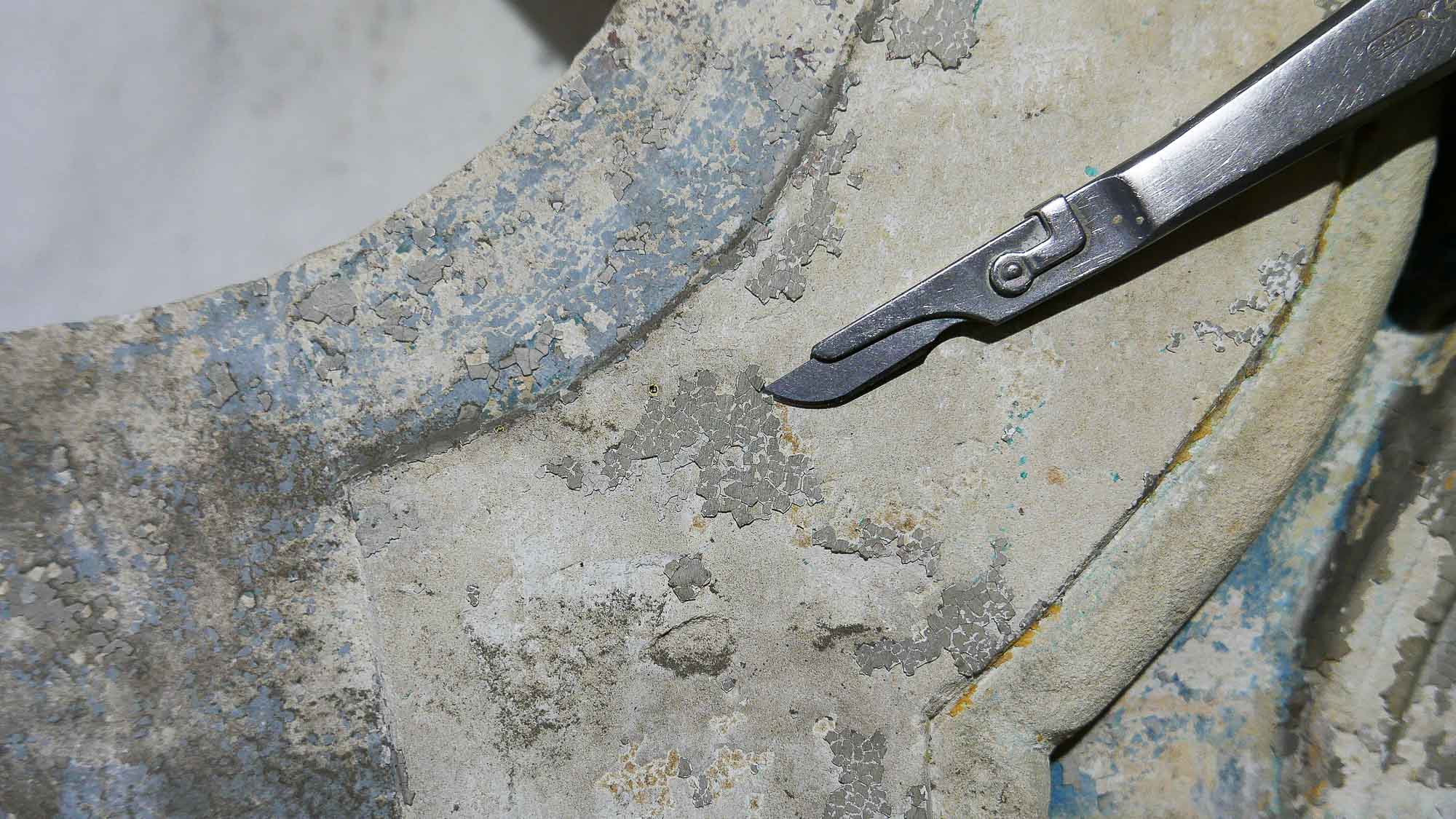 Das Relief im Inneren erwies sich als relativ stabil, sodass, abseits weniger Kittungen und Retuschen es galt, den eingetrübten Zustand optisch zu verbessern.