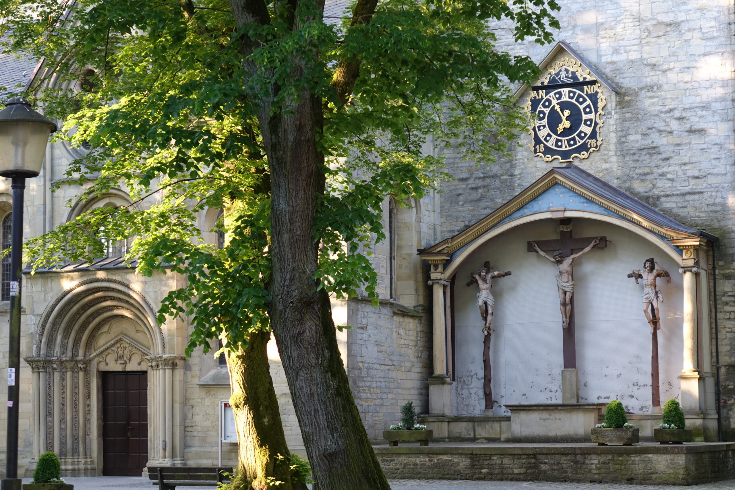 Von der Fußgängerzone aus kommend, fällt der Blick zunächst auf den 78 Meter hohen Kirchturm mit dem mächtigen Spitzhelm. Unterhalb dieser nördlich gelegenen Seite des Turms befinden sich auf einem Sockel eine Kreuzigungsgruppe, Christus und die beiden Schacher. Im Jahr 1983 wurde dieses Ensemble umfänglich restauriert.