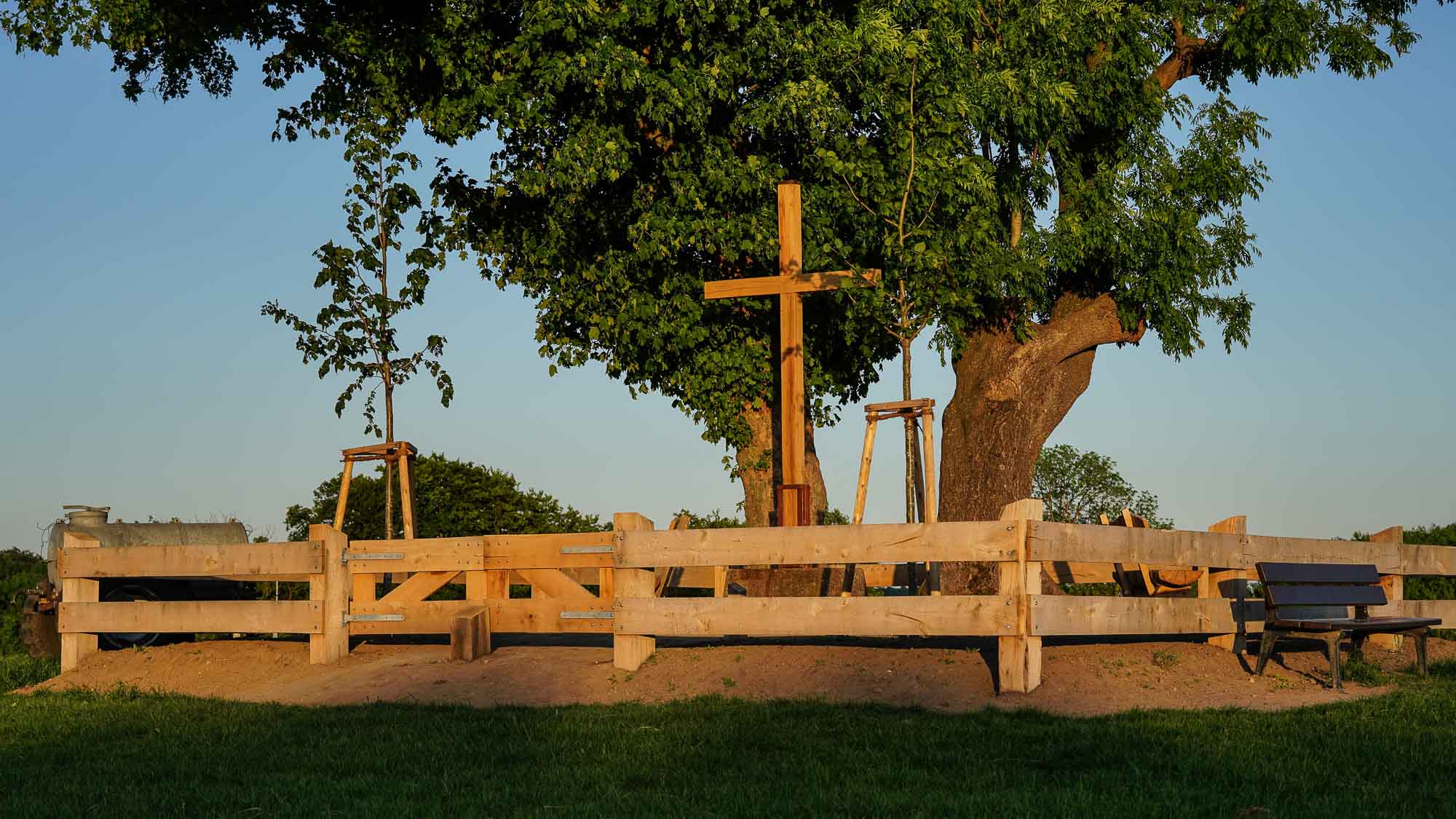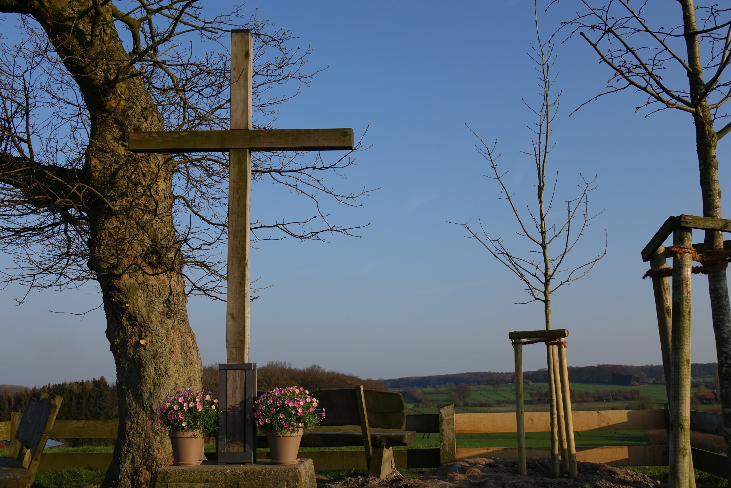 Zur Erinnerung an einen Blitzschlag. bei dem weidendes Vieh 1780 auf dem Hügel getötet wurde, soll diese Baumgruppe mit Holzkreuz errichtet worden sein. 1997 wurde das alte Holzkreuz von den „Brunnenkapitänen“ des Billerbecker Kolpingvereins erneuert.