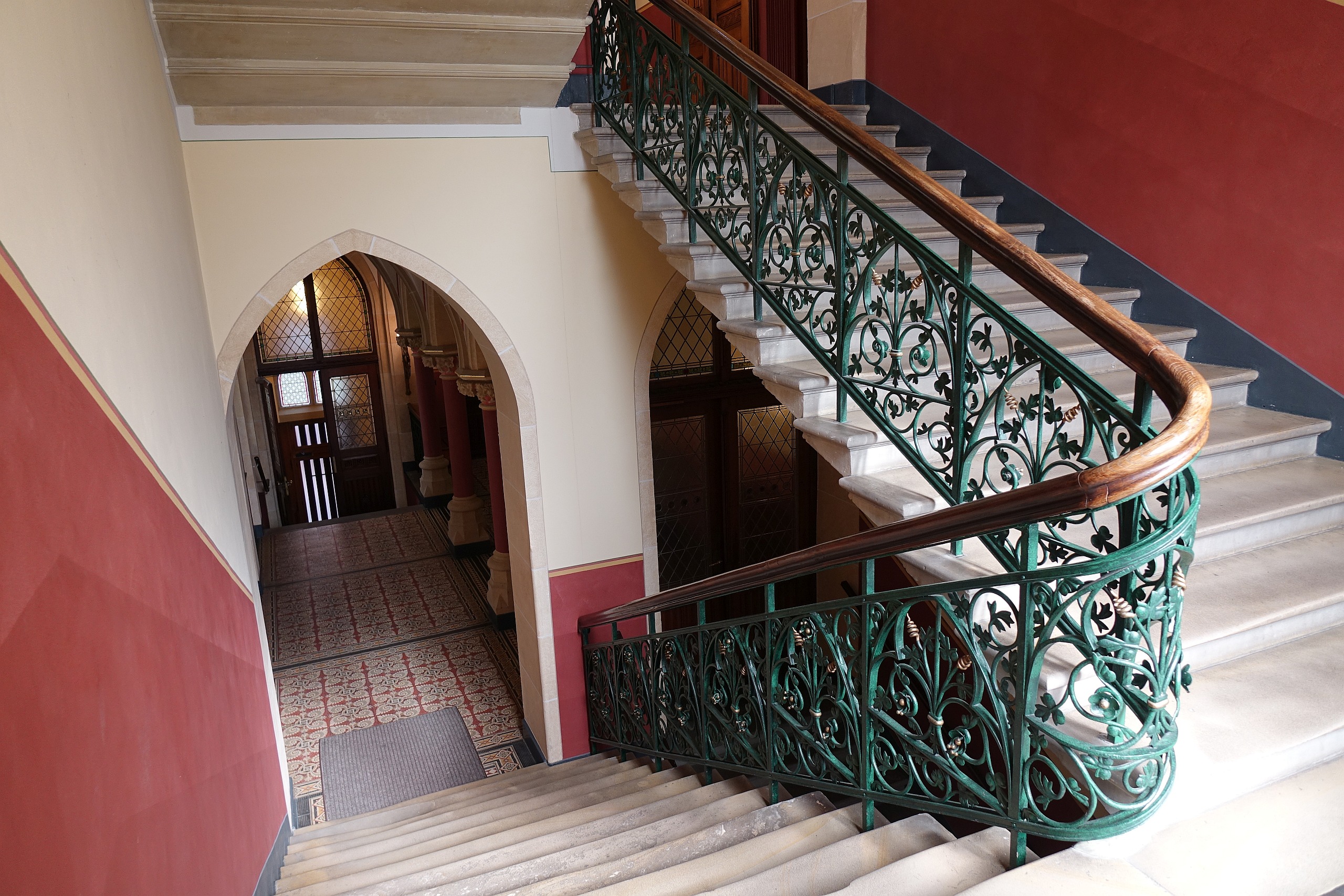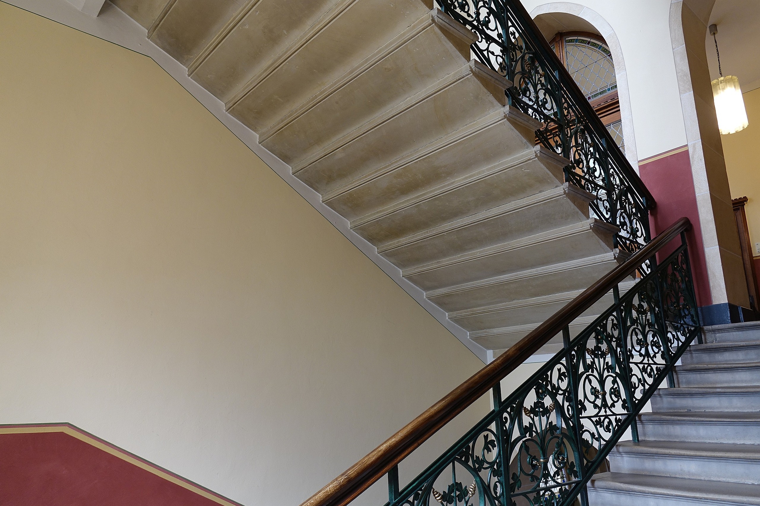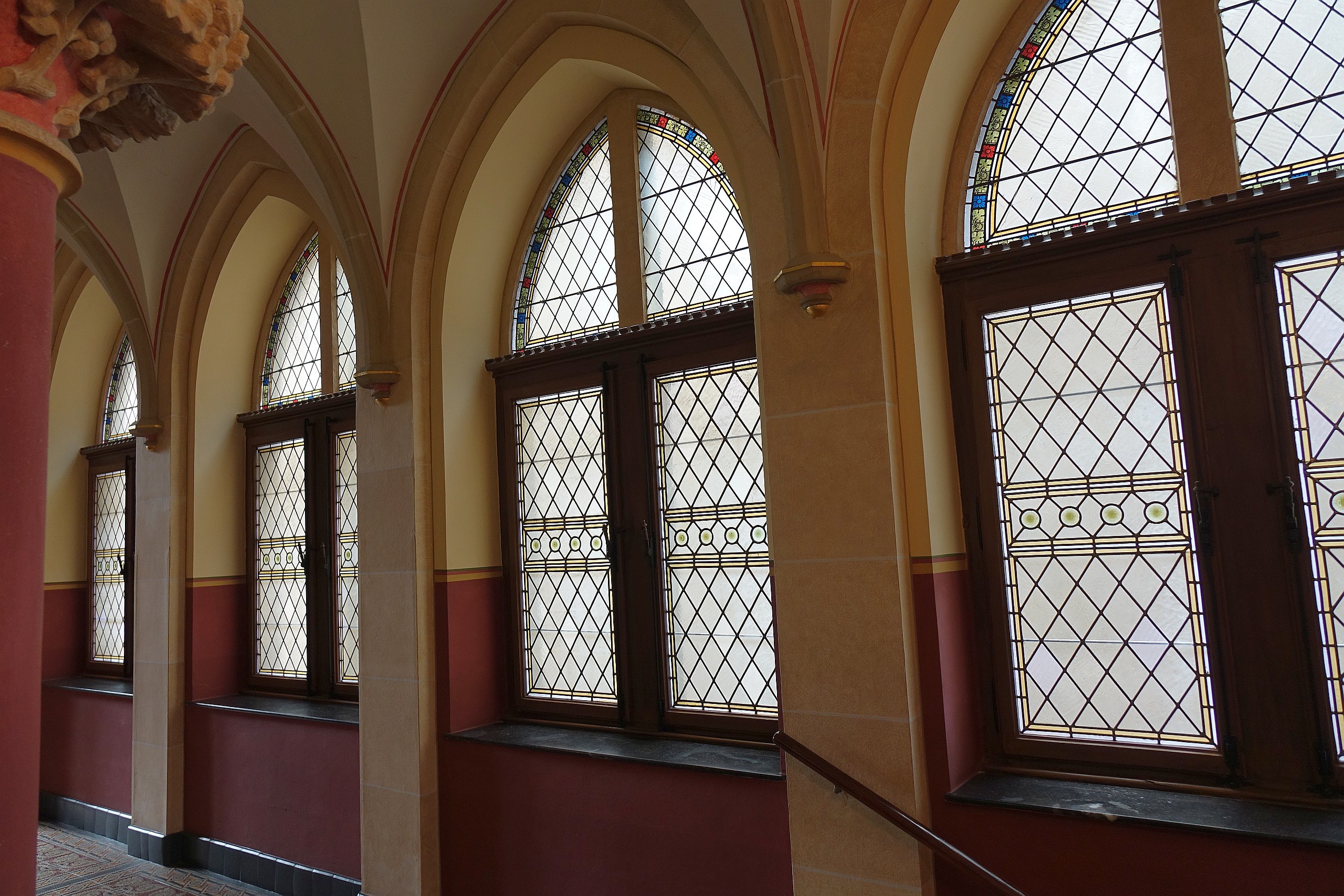 Im Untergeschoss waren Feuerwehr und Polizei untergebracht, Büros im Erdgeschoss und im Obergeschoss der Ratssaal und das Trauzimmer. Das historische Treppenhaus, liebevoll nach Originalvorlagen restauriert, ist ein besonderer Blickfang. Auch der Fußböden und Türen sind im Originalzustand erhalten. Obwohl das Geld knapp war, leistete sich die Stadt schon damals eine Zentralheizung und einen Blitzableiter. Die schmuckvolle Ausstattung beschränkte sich aber aufs Erdgeschoss. Eine Etage höher wurde es schlicht.